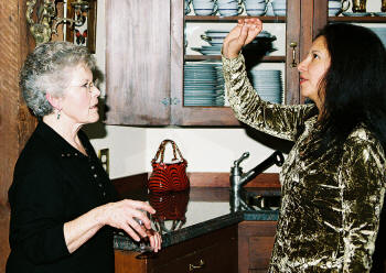 spacious home, and Perkins Coie was a generous sponsor for the event. The kitchen was a favorite hang-out of attendees (the outside veranda and lake-front view being another). The kitchen has a fireplace and is as large as the main-floor area of our West Seattle house. Alison confided to Vicki that the Dillows live in the kitchen. Vicki, listening to Francie (above), hung out here when she wasn't enthralled with exploration of the upper levels. About the house:
