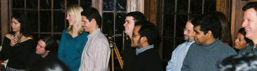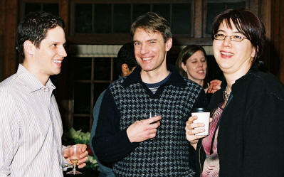Dave worked on an early version of Microsoft Word and is now in his own business, making it easy for people to compose music. He opened up his Mac and spent a good part of the evening near the living-room fireplace demonstrating what he's developed to make it easy for people to compose music. Although there were many bloggers and techno-geeks in attendance, people were mostly comparing phones. We all admired the OGO model 01+ that was being shown off. |