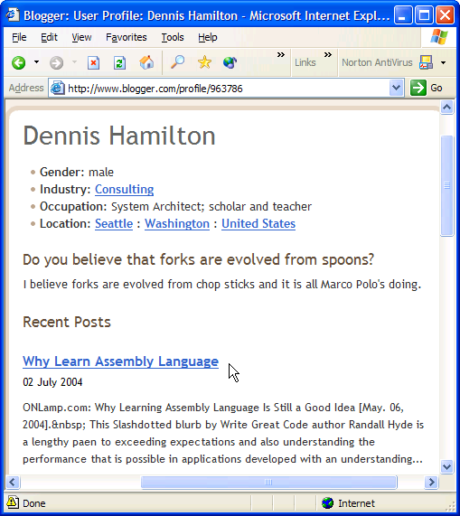 On Friday 2004-07-02 at around 04:44, I was posting a note on "Why Learn Assembly Language" from my account on Blogger.com to my Professor von Clueless in the BlunderDome blog. The posting was reported to be successful. However, I could no longer view my blog default page or the page where the article was supposed to have been loaded.