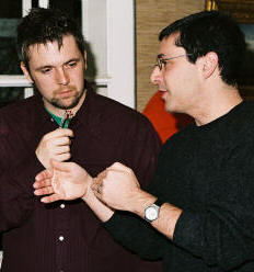 Shel making a point with Steve Broback. I only know Steve as the fellow who does magic tricks near the end of Scoble parties. But I know I've heard the name in another context, and yes I have. Steve is the force behind the Blog Business Summits, and both Robert and Shel mention him. Steve and DL Byron have a practical book on business blogging to appear later this year. |